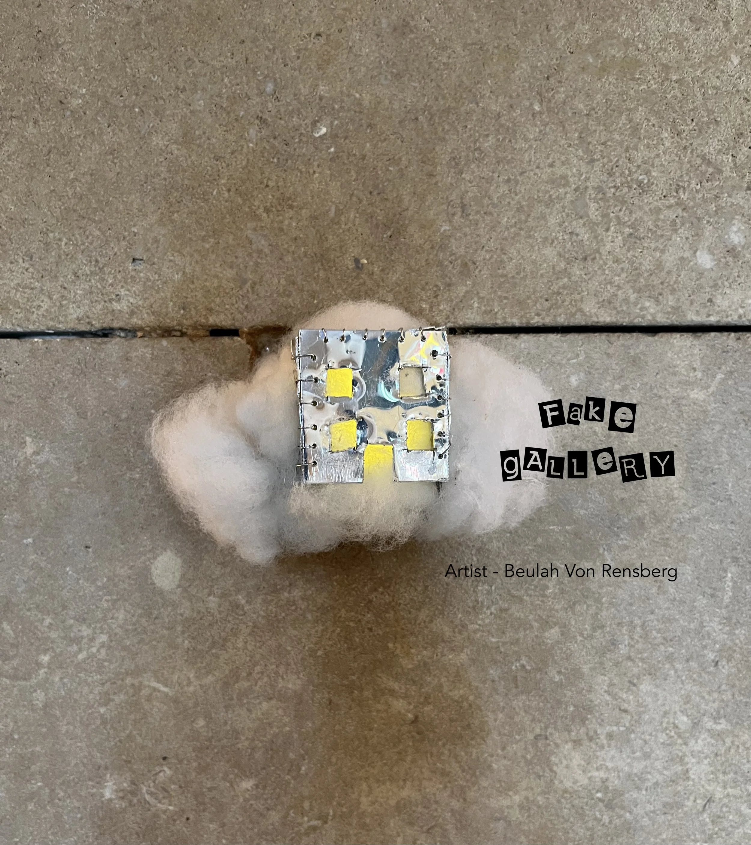 Tiny Statement | The piece "Living in a Dream" deals with the notion of what home is for all of us, proprioception comes into play depending on your background or where you are from. Stitched together with tin, a small box-shaped house, filled with a glowing cloud is the way she sees HOME. A perception of what home looks like to her. not a physical space but a feeling.