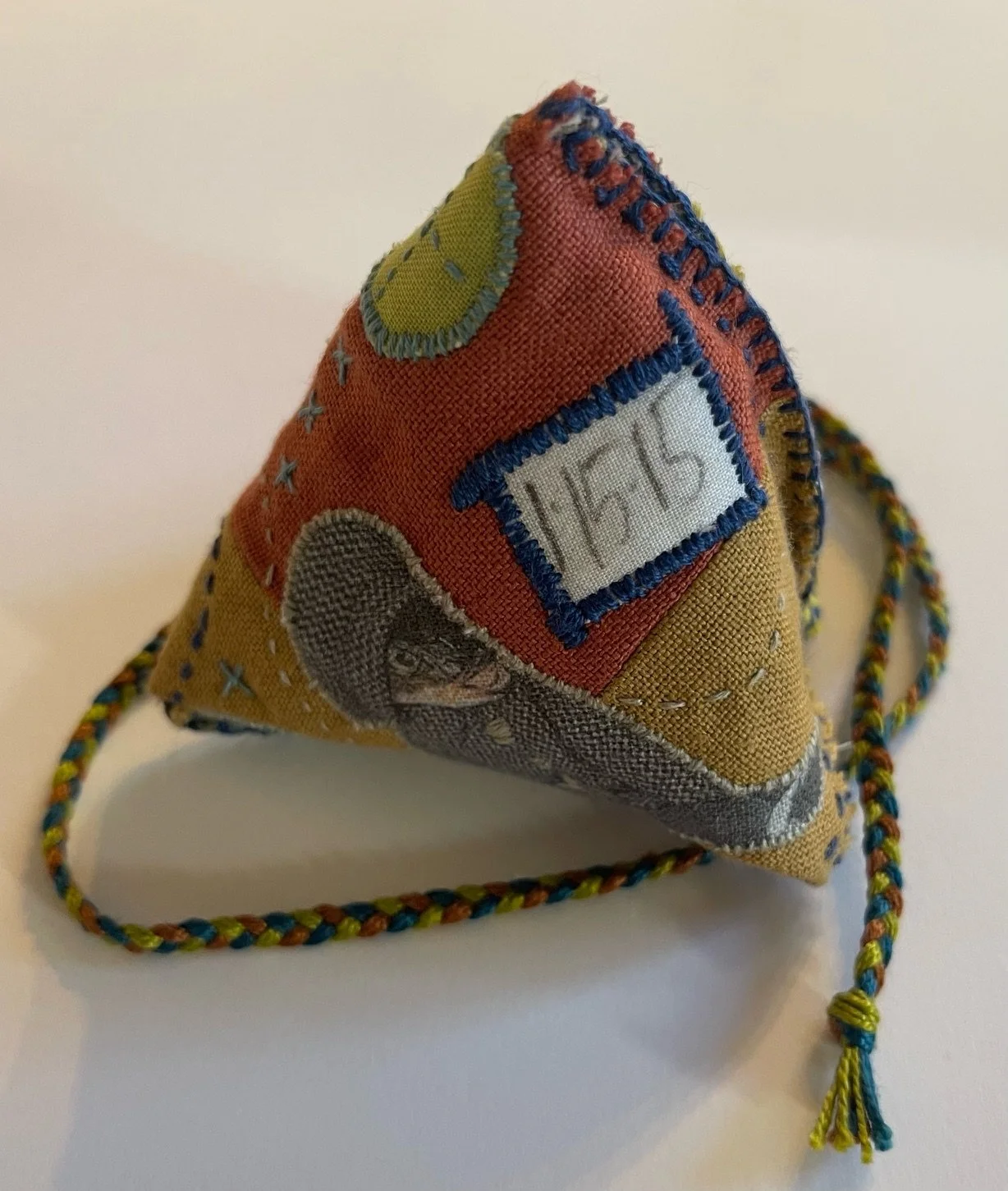 Materials | hand embroidery utilizing linen, cotton thread, metallic watercolor & wool felt Size | 3in x 3in (7.62 x 7.62 centimeters)